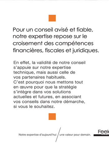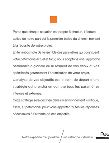 MAISON FEELEO PATRIMOINE Communication globale, print, définition de l'image de marque, création du site internet, shooting. La force d'un couple associé au service de la gestion de patrimoine. Besançon, Dijon, Paris.